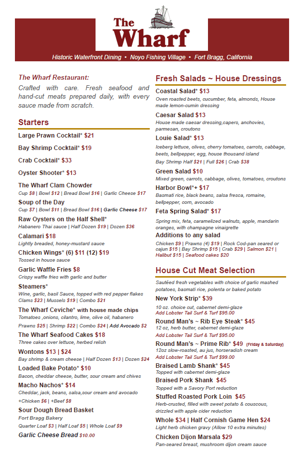 The commercial fishing fleet still sails past the Wharf’s dining room and lounge windows in pursuit of Salmon, Albacore, Cod, Sea Urchin, Red Snapper and Crab, most of which are featured on the menu. Sport fishing charter boats, whale watching excursions, private boats, Coast Guard vessels, kayaks, seals, and sea birds of all kinds will pass by as you enjoy your lunch or dinner at the Wharf. Come early to get a window table over the water and watch the world of Noyo Harbor unfold.