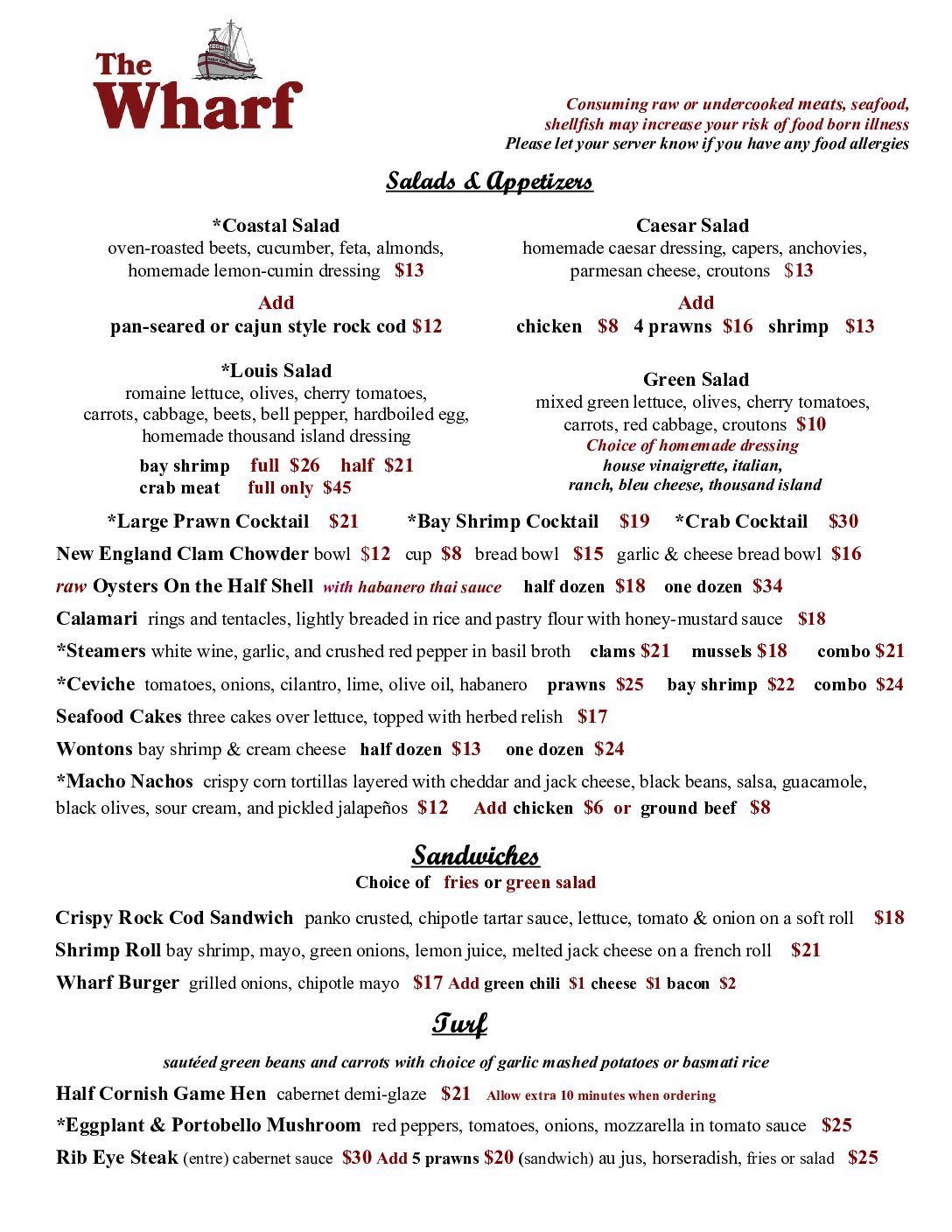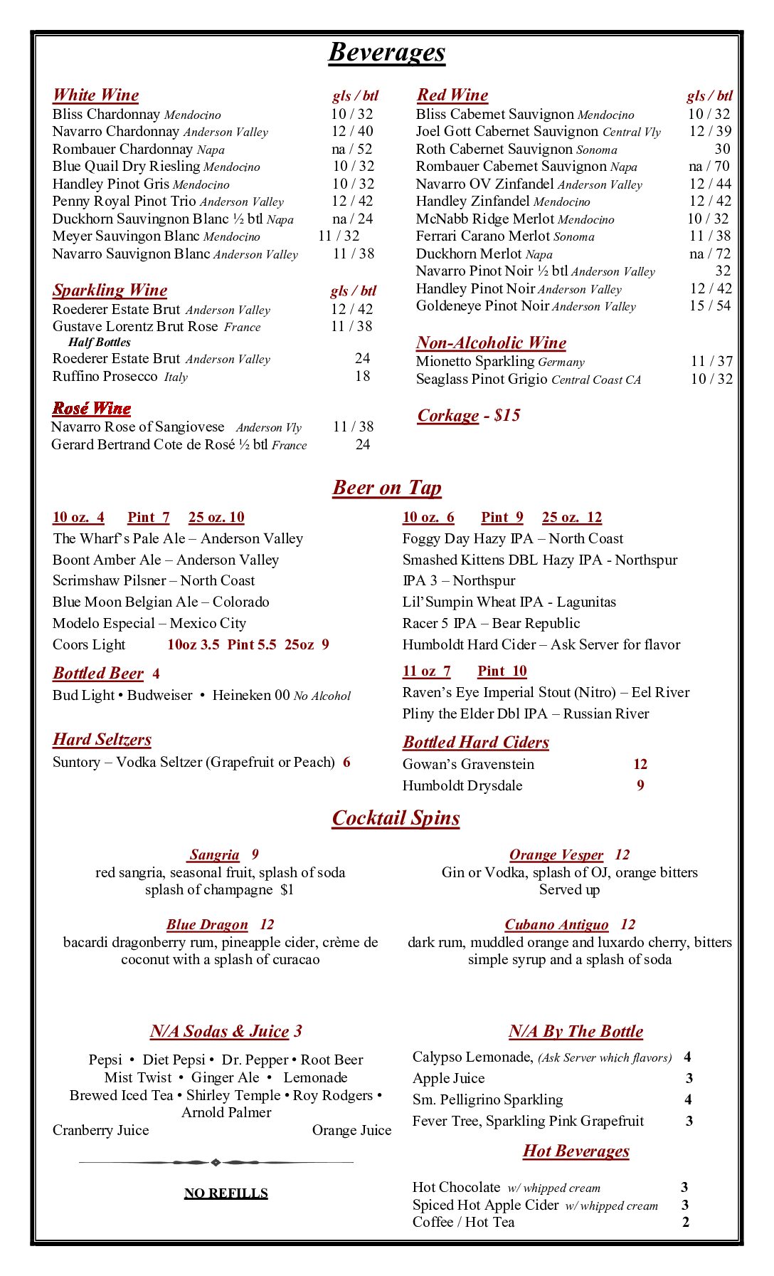The commercial fishing fleet still sails past the Wharf’s dining room and lounge windows in pursuit of Salmon, Albacore, Cod, Sea Urchin, Red Snapper and Crab, most of which are featured on the menu. Sport fishing charter boats, whale watching excursions, private boats, Coast Guard vessels, kayaks, seals, and sea birds of all kinds will pass by as you enjoy your lunch or dinner at the Wharf. Come early to get a window table over the water and watch the world of Noyo Harbor unfold.